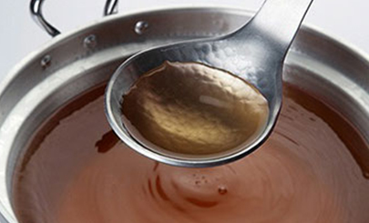 吟味を重ねた肉厚の羅臼昆布、3種の節などの厳選材料を用いた美しい"黄金色"の輝きを放つ「黄金の一汁(ひとしる)」。